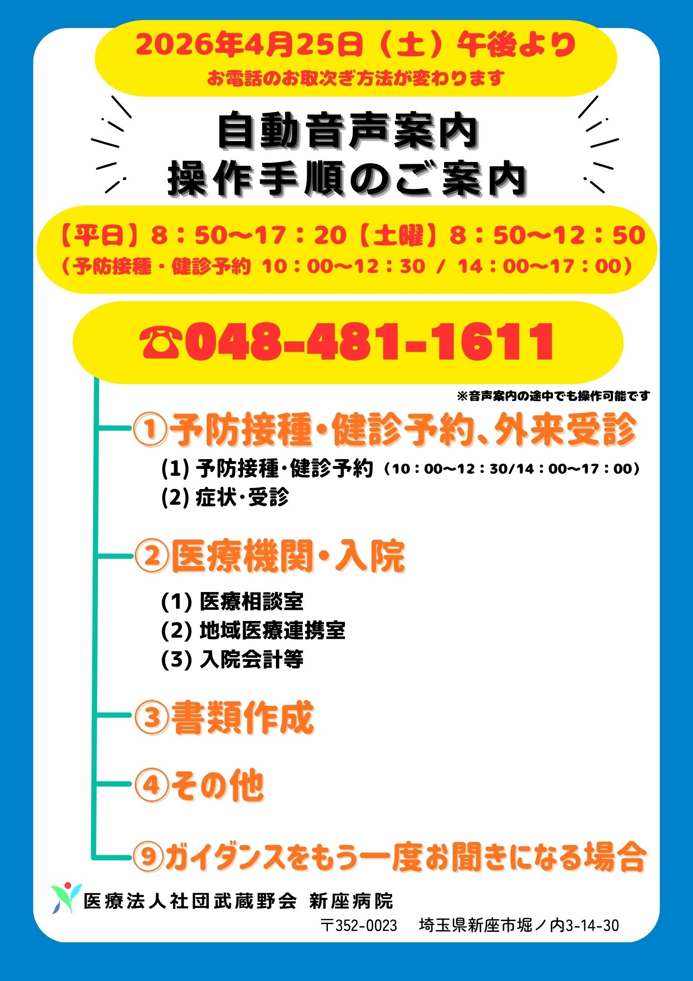2026年 4月 25日(土)午後より、お電話をご用件ごとに関連部署へおつなぎし、よりスムーズに対応させていただくため、自動音声案内システムを導入いたします。